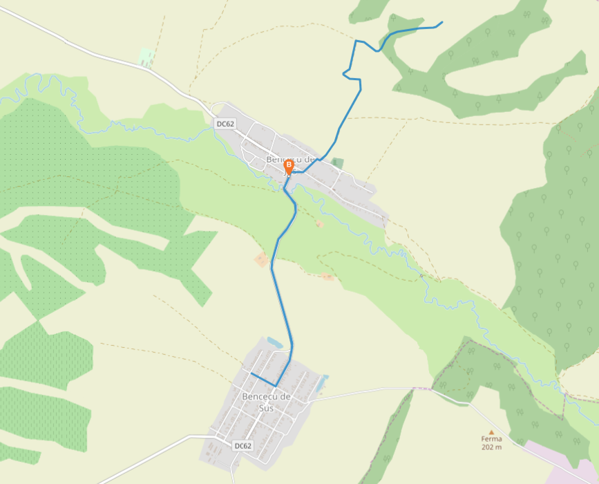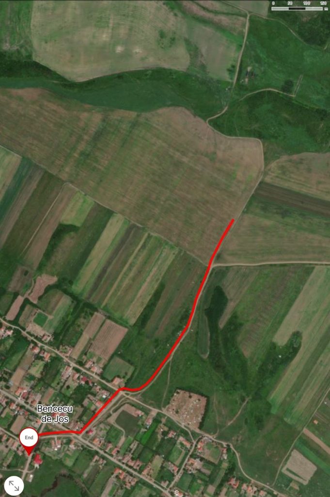 START: A – fântâna publică de lângă locul de joacă pentru copii, vizavi de Căminul Cultural > pornim înspre centrul satului Bencecu de Jos > la prima intersecție 45 de grade la dreapta pe drum asfaltat în ușoară urcare > traversare DC 62 > în sus pe drumul asfaltat > la prima intersecție 45 de grade la dreapta pe drumul de pământ > urcare lentă pe drumul de pământ > la intersecție înainte > urcare lină până în vârful dealului > coborâre pe drumul de pământ > urmăm drumul în curbă la dreapta > coborâre pe poteca din stânga gardului > la intersecția cu pârâul (poate fi secat) la dreapta > înainte pe potecă > la capătul gardului urcăm la stânga întâi lent apoi susținut, pentru câteva zeci de metri > urcare până în vârful dealului > la km 2.8, întoarcere 180 de grade > revenim pe același traseu la fântâna din dreptul Căminului Cultural > înainte pe DC 62 spre Bencecu de Sus > după biserica catolică, la dreapta > înainte până la a doua intersecție > întoarcere 180 de grade > revenim pe același drum > fântâna din dreptul Căminului Cultural – B > FINISH